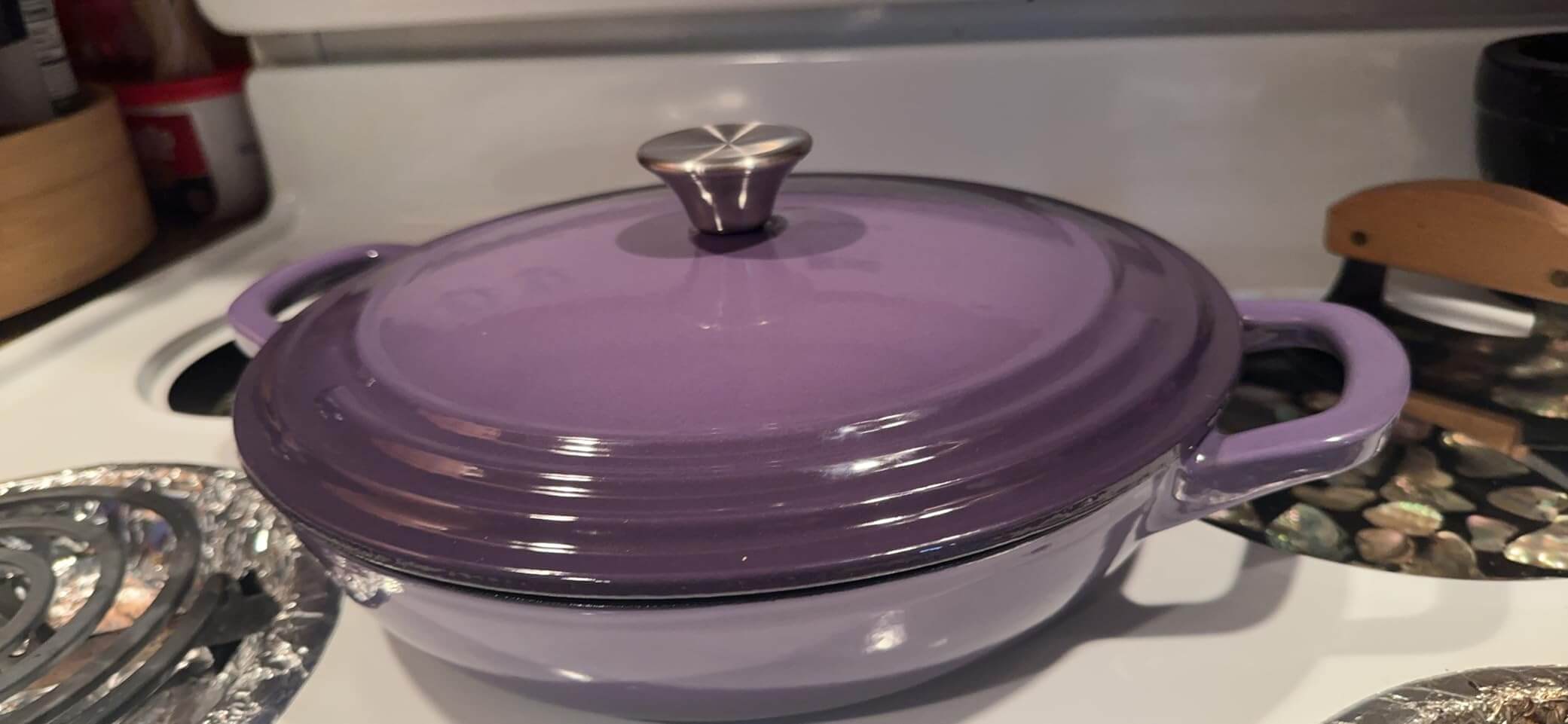 I love the purple color! It’s heavy as expected but not too much. Perfect shallow pan for my leaning stove.