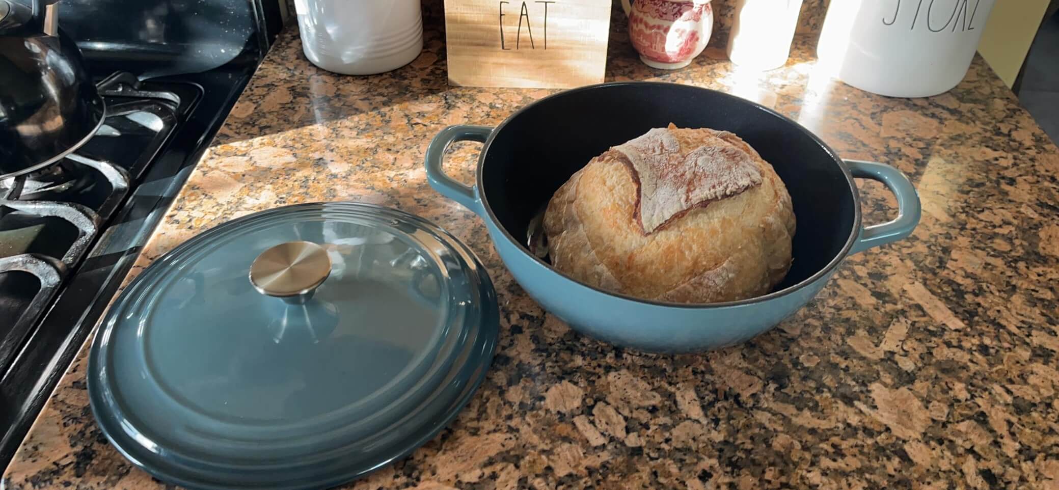 - Heat your pan gently on low to medium heat. Taking it slow helps protect the enamel and ensures your bread bakes evenly every time.