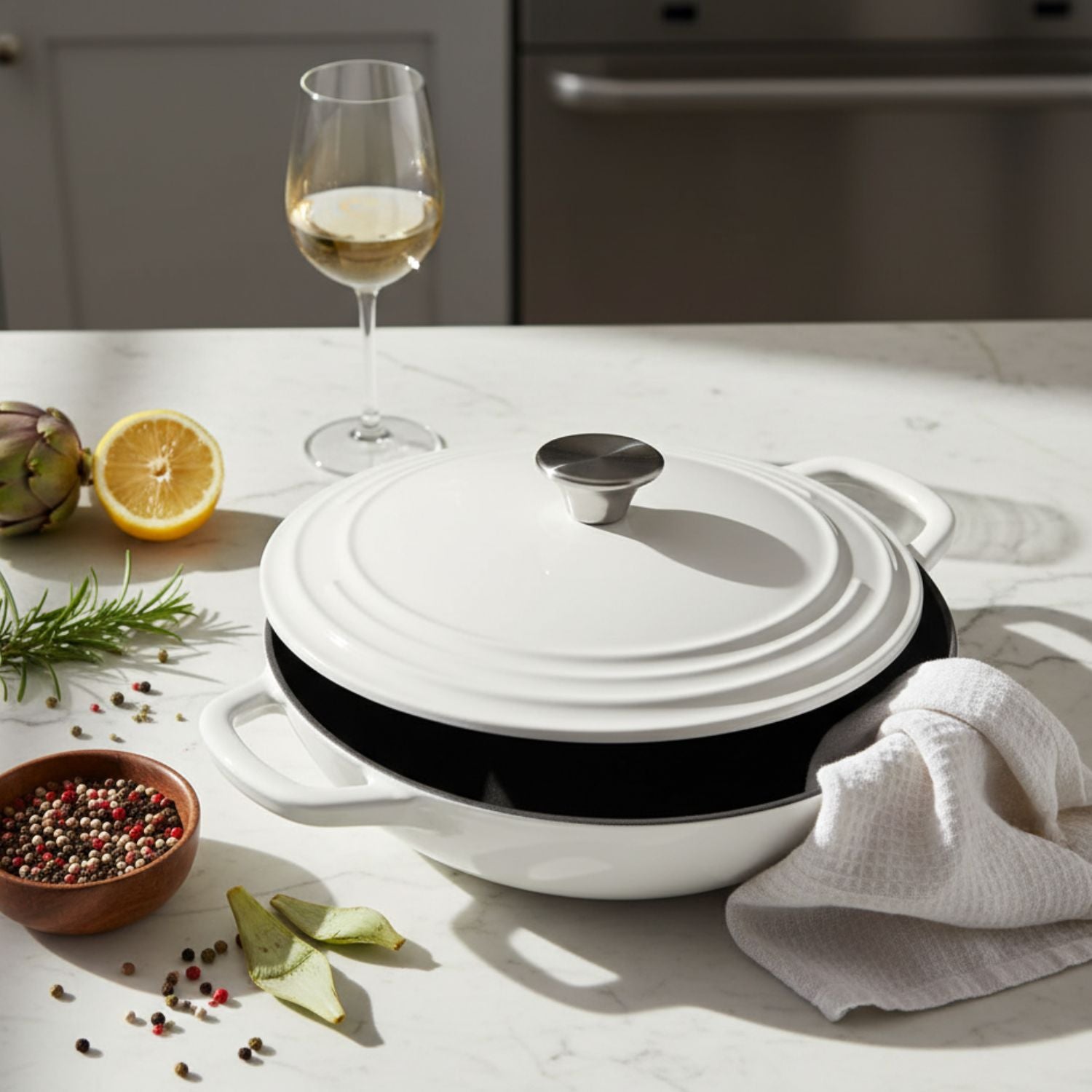A deep Dutch oven is perfect for soups and big stews and a skillet shines for quick sears, but this shallow casserole is built for the dishes that start with a good sear and finish in the oven, giving you a wide base for browning in a single layer, low sides that help sauces reduce and edges crisp, and a lid that keeps food juicy, so you can sear chicken thighs, reduce a sauce, and bake everything to a bubbling finish in one pan.