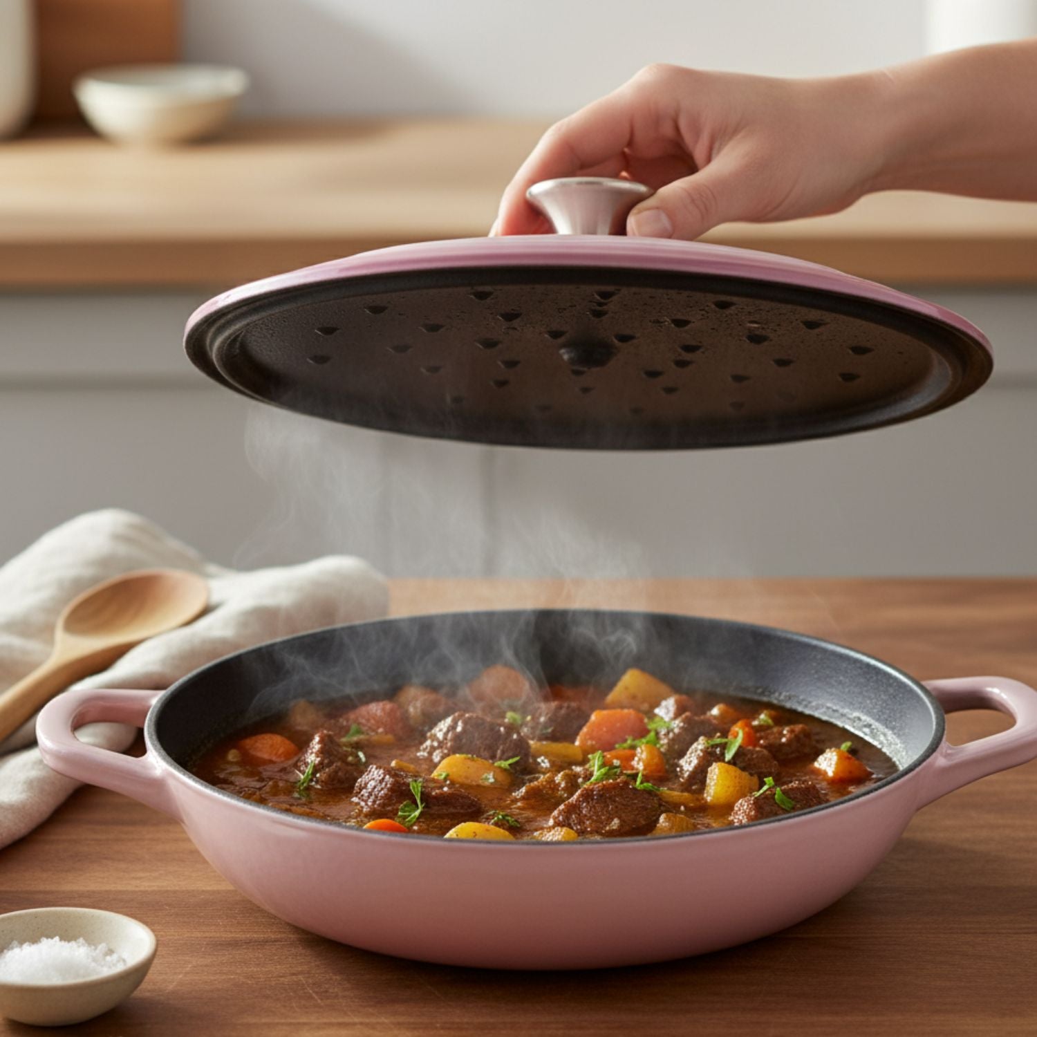 A wide, shallow base gives your food room to brown in a single layer, then simmer down soft and saucy. Enameled cast iron holds steady heat on low and medium, while the smooth interior needs no seasoning and washes clean with warm, soapy water.