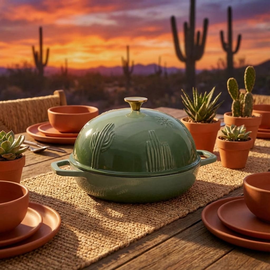 Featuring a unique embossed cactus relief and a sturdy heat-resistant gold knob, this pot is designed to be seen. The knob isn't just for looks—it’s shaped for a secure, comfortable grip, making it easy to lift the heavy lid even with bulky oven mitts.