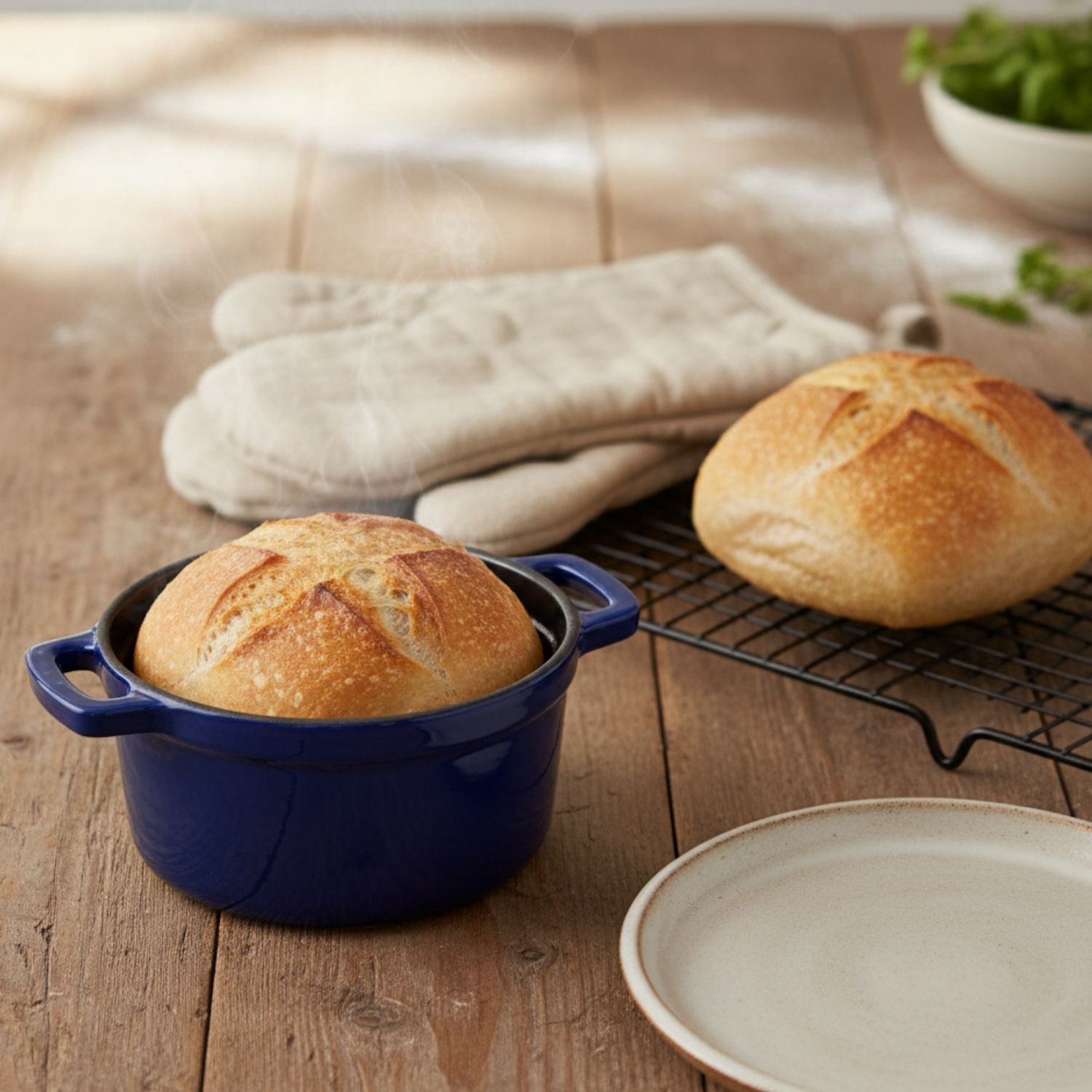 - Heat your pan gently on low to medium heat. Taking it slow helps protect the enamel and ensures your bread bakes evenly every time.