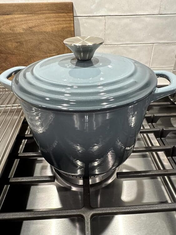 This tall enameled cast iron pot holds steady heat and traps steam under a heavy lid, which helps rice cook evenly and turn out fluffy without drying out. The upright shape also keeps bubbling under control and reduces evaporation, so you get more consistent results in a smaller, stovetop-friendly size.